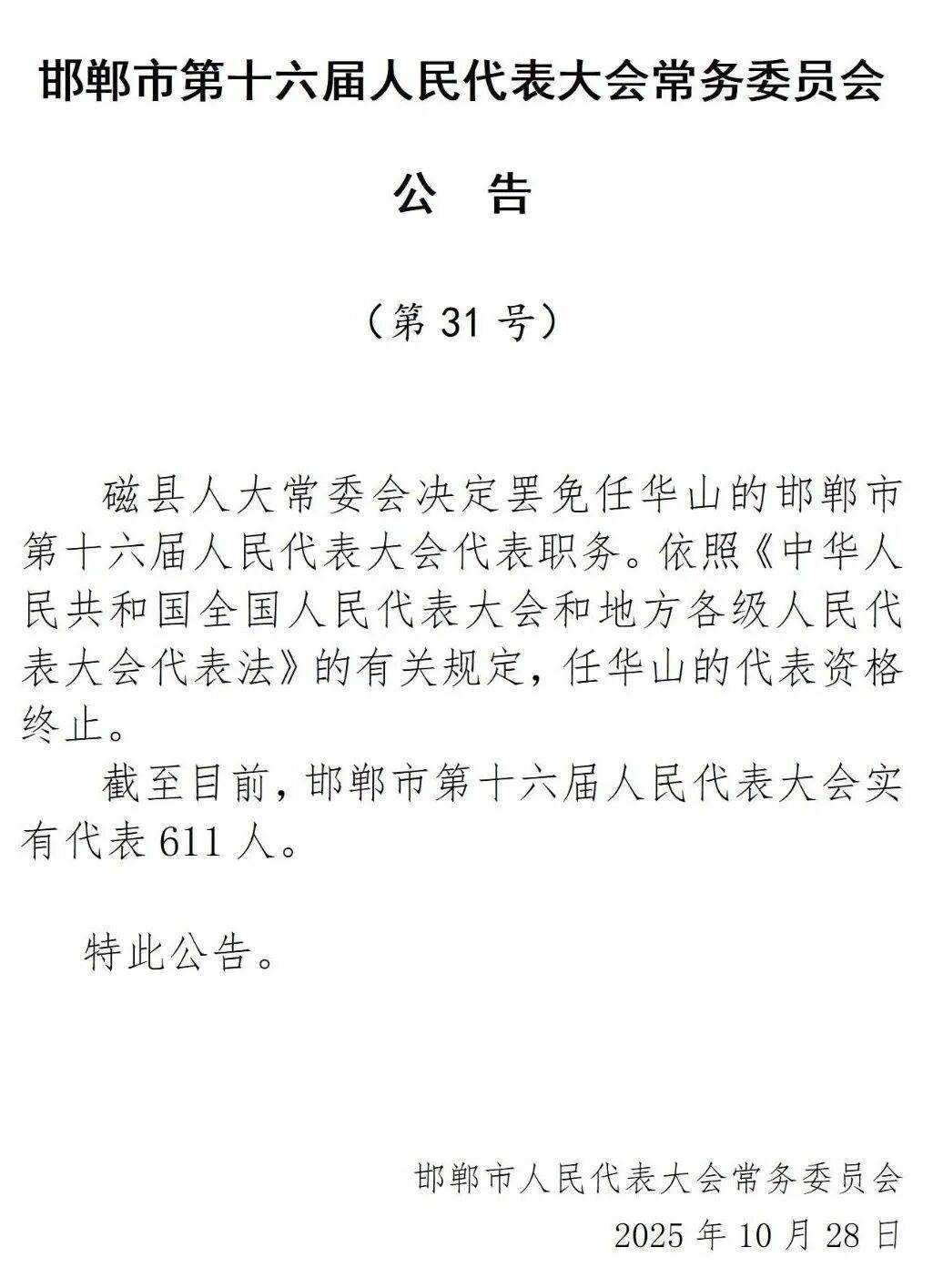 今年1月18日,任华山被任命为邯郸市副市长,至此番被免职,并罢免邯郸市人大代表职务。