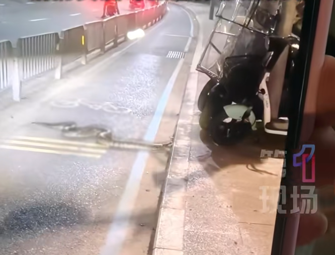 20斤大蟒蛇深夜横穿马路被车辆压伤尾部,市民发现并报警
