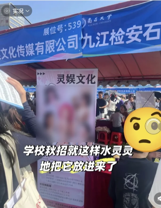 据媒体此前报道,近日,有网友发帖称,江西某211招聘现场现露骨女主播招聘海报,在其拍摄的照片中,展位号后带有南昌大学标识。