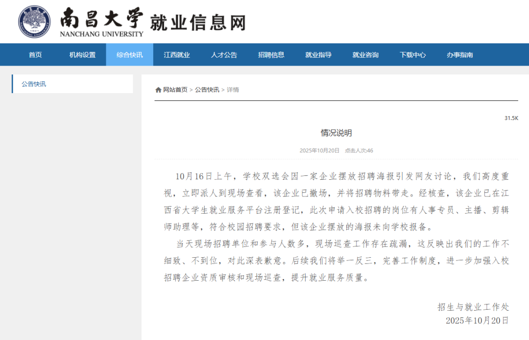 10月16日上午,学校双选会因一家企业摆放招聘海报引发网友讨论,我们高度重视,立即派人到现场查看,该企业已撤场,并将招聘物料带走。经核查,该企业已在江西省大学生就业服务平台注册登记,此次申请入校招聘的岗位有人事专员、主播、剪辑师助理等,符合校园招聘要求,但该企业摆放的海报未向学校报备。
